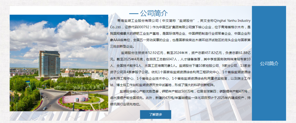 盐湖股份官网介绍,公司作为中国五矿集团有限公司旗下核心企业,位于青海省格尔木市,是我国规模最大的钾肥工业生产基地,截至2024年末,资产总额457.82亿元,负债总额61.88亿元。截至2025年4月底,在册员工总数6047人,下辖10家控股公司、9家分公司、13家全资子公司及4家参股子公司。其称,盐湖股份核心产能优势显著,钾肥年产能达500万吨,位居全球第四;碳酸锂年产能4万吨,卤水提锂产能全国领先。