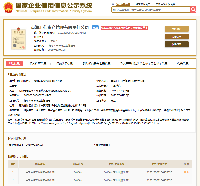 青海汇信资产管理有限责任公司则成立于2019年,注册资本260000万元人民币,法定代表人为王祥文,由中国盐湖工业集团有限公司全资持股。