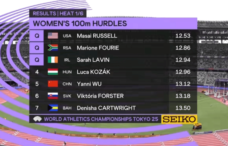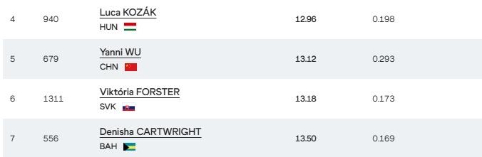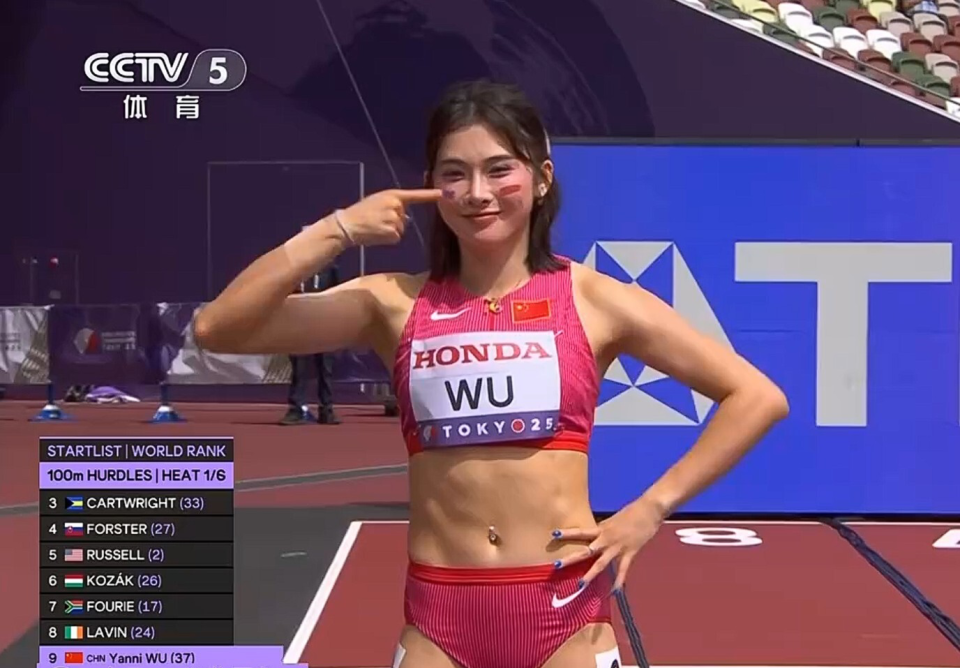 在起跑环节,吴艳妮有点受到旁边选手的影响,反应时间只有0.293秒,在本组所有选手中排名最后。对此吴艳妮也在赛后接受央视采访时表示:“世锦赛我就是按照自己一些预期吧,就是破13大关。理想的话就是跑12秒8,12秒80左右。”